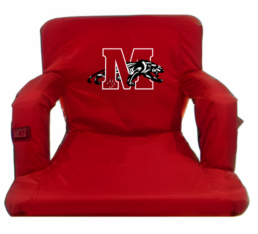 Maypearl High School Portable Folding Stadium Chair comes with White and black logo on Red waterproof nylon material. Folding chair design with nylon waterproof material sheds water and other precipitation while offering the maximum comfort of 3 ½ inches of padding. Stadium seat boasts 6 positions of recline with armrests and 3 pockets to store drinks and necessities. Luxury seating begins with 3-heat settings in the bottom cushion, is amplified with 3-massage settings in the backrest and is 26 inches wide for maximum space and comfort. Stadium Chair folds flat and is light-weight with integrated backpack straps for easy carry and hands-free walking. Bleacher seat is secured by safety strap that attaches spectator chair to open bleacher. Chair is complete with 10,000 MAH battery pack and a life-time warranty.