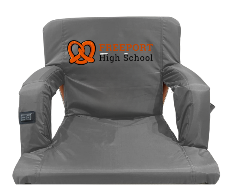 Freeport High School Portable Folding Stadium Chair comes with orange and black logo on Gray waterproof nylon material. Folding chair design with nylon waterproof material sheds water and other precipitation while offering the maximum comfort of 3 ½ inches of padding. Stadium seat boasts 6 positions of recline with armrests and 3 pockets to store drinks and necessities. Luxury seating begins with 3-heat settings in the bottom cushion, is amplified with 3-massage settings in the backrest and is 26 inches wide for maximum space and comfort. Stadium Chair folds flat and is light-weight with integrated backpack straps for easy carry and hands-free walking. Bleacher seat is secured by safety strap that attaches spectator chair to open bleacher. Chair is complete with 10,000 MAH battery pack and a life-time warranty.
