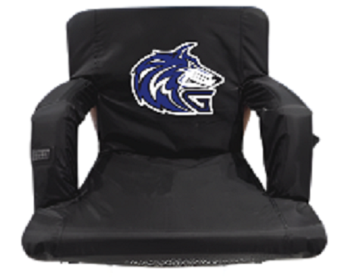 Grandview High School Portable Folding Stadium Chair comes with blue and white logo on Black waterproof nylon material. Folding chair design with nylon waterproof material sheds water and other precipitation while offering the maximum comfort of 3 ½ inches of padding. Stadium seat boasts 6 positions of recline with armrests and 3 pockets to store drinks and necessities. Luxury seating begins with 3-heat settings in the bottom cushion, is amplified with 3-massage settings in the backrest and is 26 inches wide for maximum space and comfort. Stadium Chair folds flat and is light-weight with integrated backpack straps for easy carry and hands-free walking. Bleacher seat is secured by safety strap that attaches spectator chair to open bleacher. Chair is complete with 10,000 MAH battery pack and a life-time warranty.