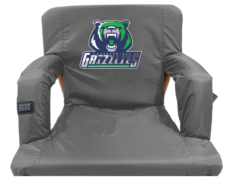 ThunderRidge High School Portable Folding Stadium Chair comes with ThunderRidge Grizzlies multi-colored logo on Gray waterproof nylon material. Folding chair design with nylon waterproof material sheds water and other precipitation while offering the maximum comfort of 3 ½ inches of padding. Stadium seat boasts 6 positions of recline with armrests and 3 pockets to store drinks and necessities. Luxury seating begins with 3-heat settings in the bottom cushion, is amplified with 3-massage settings in the backrest and is 26 inches wide for maximum space and comfort. Stadium Chair folds flat and is light-weight with integrated backpack straps for easy carry and hands-free walking. Bleacher seat is secured by safety strap that attaches spectator chair to open bleacher. Chair is complete with 10,000 MAH battery pack and a life-time warranty.